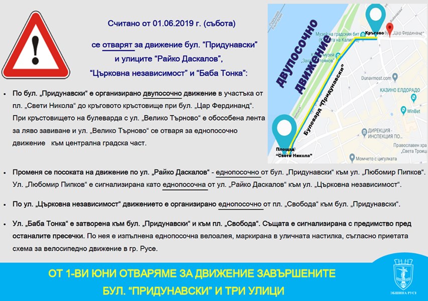Във връзка с приключилите строителни дейности бул. „Придунавски“- част от проект „Интегрирана система за градски транспорт на град Русе - 2 етап“, ул. „Баба Тонка“, ул. „Църковна независимост“и ул. „Райко Даскалов“– част от проект „Реконструкция и рехабилитация на пешеходна среда и изграждане на зони за обществен отдих“ на Община Русе, считано от 01.06.2019 г. (събота) се отварят за движение на МПС.