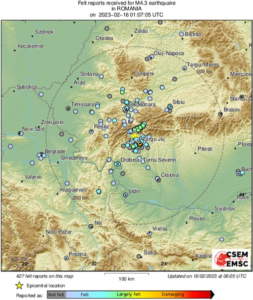 Отново епицентърът е около Турну Северин в югозападната част на страната и на около 110 км от границата с България.