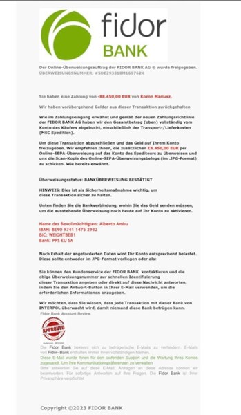 Междувременно обаче мъжът получава имейл с банков документ, че парите за колата са преведени, но поради политика за безопасност на банката сумата е задържана. Финансовата институция, за която се твърди, че е издала документа, е немската FIDOR BANK AG. За да бъде освободена транзакцията, трябва да се извърши допълнителен превод от €6450,00 EUR по сметката чрез онлайн SEPA превод.
