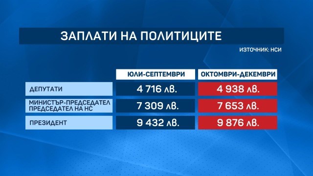 Заплатите на премиера и на председателя на Народното събрание са еднакви. Те взимат депутатска заплата плюс още 55%. Президентът се подписва върху две депутатски заплати.