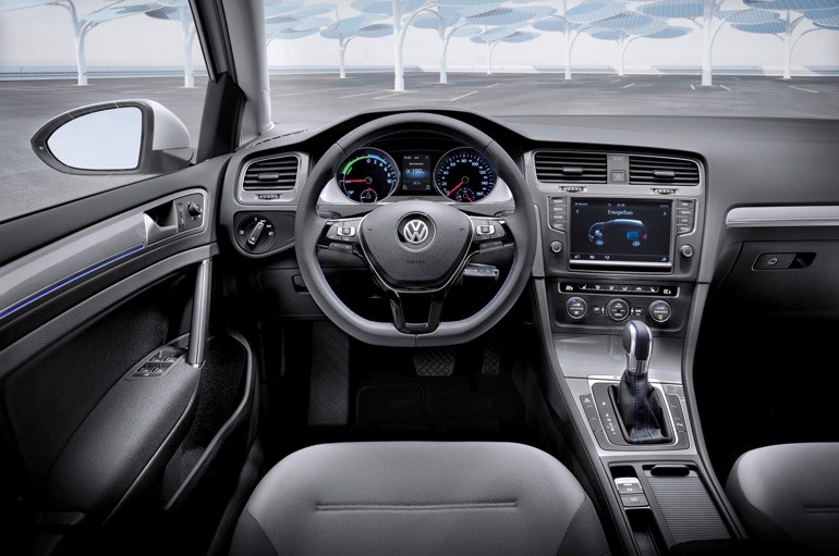 Освен стандартните функции на него може да се показва схемата на работа на електрозадвижването и разпределението на енергията. Предните седалки в e-Golf са сравнително еластични и се регулират в големи интервали. Тъй като акумулаторните батерии се намират в двойното дъно под седалките на втория ред, те не са намалили пространството в салона. Размерът на багажника също не е пострадал и е 380 л в нормално състояние и 1270 л със скръстени задни седалки. Отделението под пода не може да се използва. Тъй като е флагман в линията, оборудването на електрическия e-Golf е много богато.
