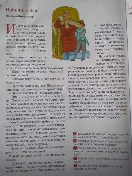 Става дума за произведението „Новият закон“ на австрийска писателка Кристине Ньостлингер, включено в учебник на едно от издателствата, пише Монитор.