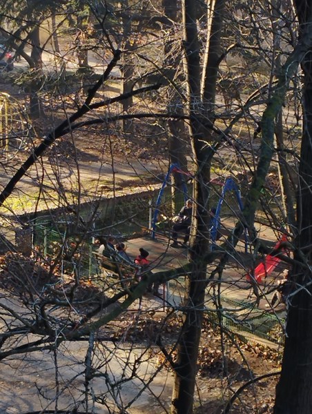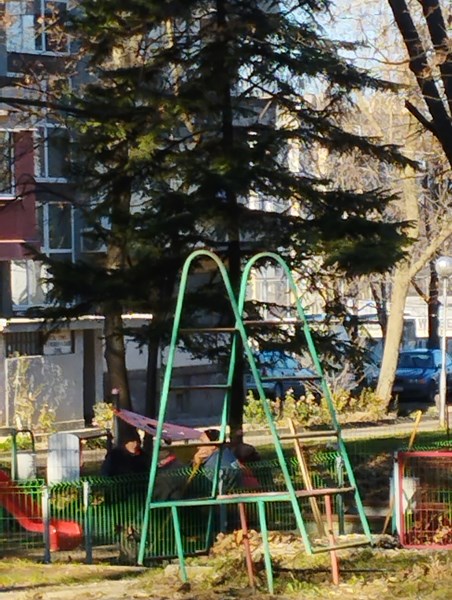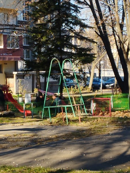 Пред блок Силистра, вход В, два часа работниците по чистотата си почиват след новогодишно по пейките на детската площадка.