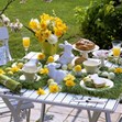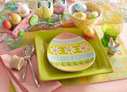 Великденското зайче може да стои в средата на масата във вид на порцеланова статуетка, шоколадова фигурка, а между чиниите можете да разпръснете живи цветя и върбови клонки.