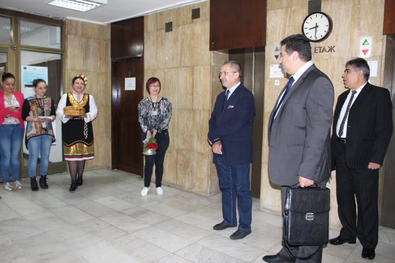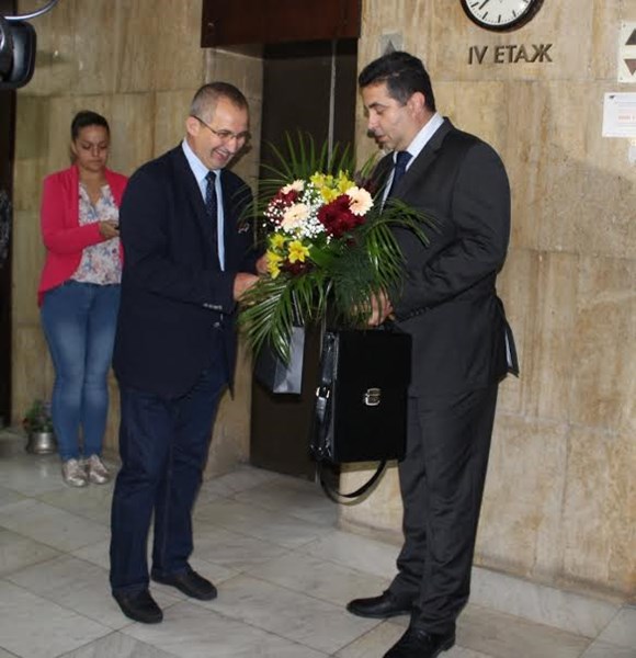 Стефко Бурджиев и заместник областните управители Валентин Колев и Свилен Иванов придружиха г-н Григоров до четвъртия етаж на Областна администрация, където го очакваха всички служители. По стара българска традиция беше посрещнат с менче с китка здравец и питка с мед за сполука и здраве.