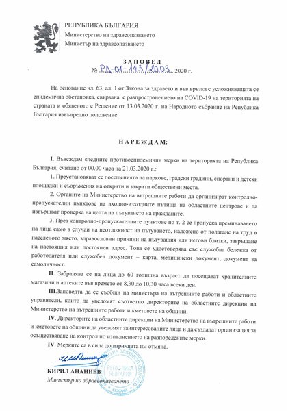 В нея е посочено единствено че се забранява "на лица до 60-годишна възраст да посещават хранителните магазини и аптеките във времето от 8.30 до 10.30 ч. всеки ден". Идеята е възрастните хора да не се засичат с потока на хората, които отиват на работа, обясни в петък шефът на кризисния щаб ген. Венцислав Мутафчийски и добави, че това било за тяхната безопасност, да има време, в което не се срещат с млади хора, които могат да ги заразят.