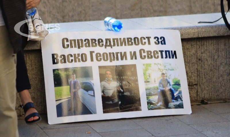 Протестните плакати гласят "Справедливост за Васко, Георги и Светли", "Политиците, убийци на народа".