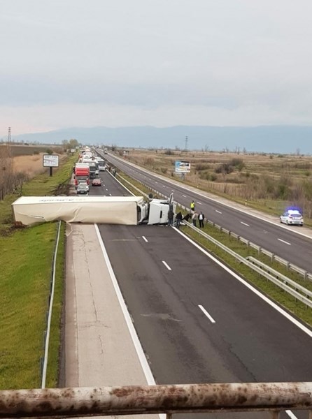 Камионът, който е с турска регистрация, се е преобърнал на платното, след като шофьорът е загубил управление. Няма пострадали при инцидента, нанесени са само материални щети на превозното средство.
