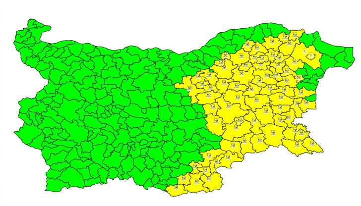 Предупреждението ще бъде в сила за Велико Търново, Търговище, Разград, Шумен, Силистра, Добрич, Варна, Бургас, Ямбол, Сливен, Хасково и Кърджали. Очаква се те да започнат в неделя следобед.