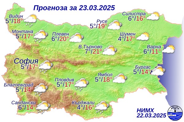 Атмосферното налягане ще остане малко по-високо от средните стойности за сезона, но ще се понижава през деня и ще се доближи до нормата, според данните на Националния институт по метеорология и хидрология (НИМХ) от 22 март 2025 година.