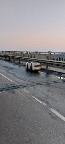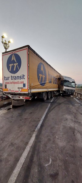Товарен автомобил с турска регистрация самокатастрофира на Дунав мост при Русе рано тази сутрин, съобщават от Областна администрация - Русе. Камионът се е движел с превишена скорост, което е предизвикало дефект на една от фугите по моста. Така се е стигнало и до пробиване и откъсване на резервоара от автомобила и съответно разливане на гориво.