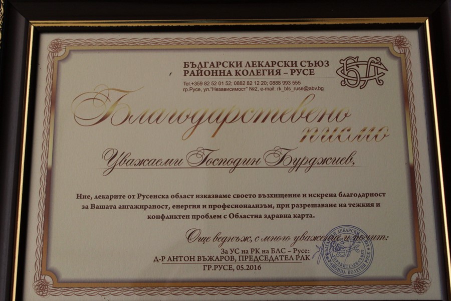 Преди броени минути, по време на нарочно организирано съвещание, членовете на Районната колегия на Български лекарски съюз в Русе удостоиха областния управител на Област Русе с приз.