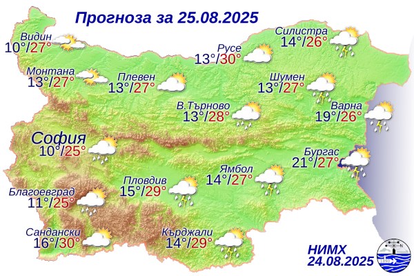 На 25 август 2025 година през страната ще премине студен атмосферен фронт, който ще донесе промени във времето, особено по отношение на облачността и валежите, съобщават от Националния институт по метеорология и хидрология.