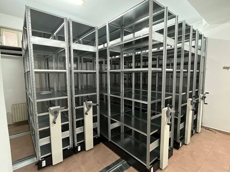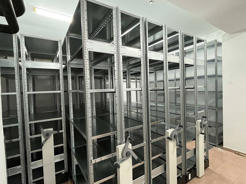 Модерните метални стелажи дават възможност за оптимизиране на наличните пространства, като позволяват съхраняването на по-голям брой фондови единици без това да се отразява на качеството на работа. Благодарение на специалната система с релси и ръчен механизъм, стелажите могат да се придвижват лесно и да формират коридори, осигуряващи достъп до конкретни рафтове.