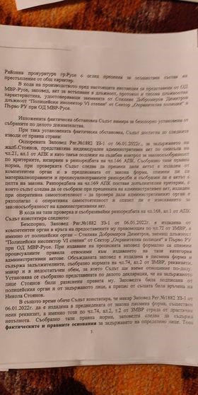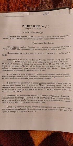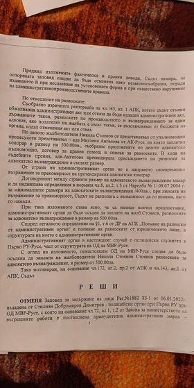 МВР е осъдено в Решение 62/26.01.22г. РРС да плати 500 лв. разноски по делото за първа инстанция. Счита, че няма да бъде обжалвано решението тъй като са наясно, че заповедта е издадена и е незаконосъобразна и само ще имат още разноски.