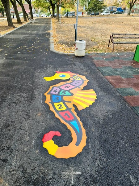 Още една локация е избрана за поставянето на забавните изображения. Детската площадка на реновираният пл. „Дунав“ доби нов вид, като на нея бе разположен цветен стикер, който дава възможност за развиване на физическите способности на най-малките.