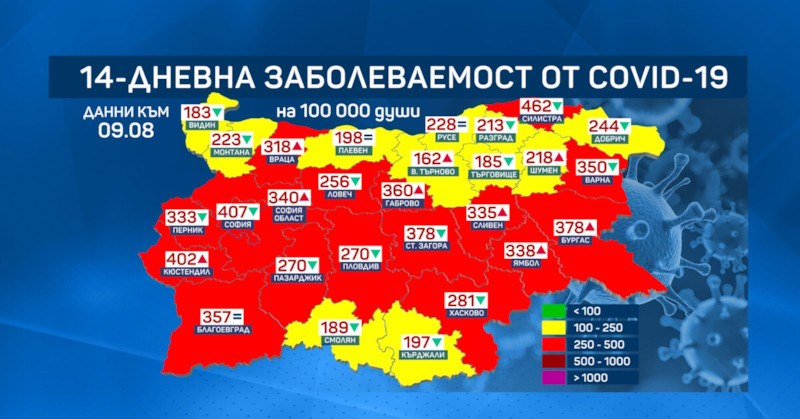Има обаче и области с рекордна заболеваемост за последните 14 дни – Благоевград, Велико Търново, Габрово, Добрич, Кюстендил, Пловдив, Русе, Сливен, Хасково и Ямбол.