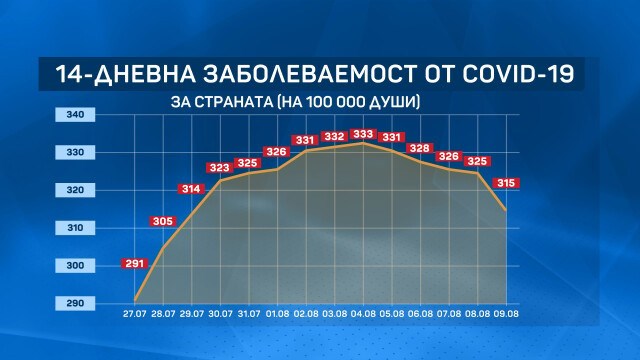 Продължава да спада общата заболеваемост от COVID-19 у нас на 14-дневна база – днес тя е 315 на 100 000 души при 325 вчера.