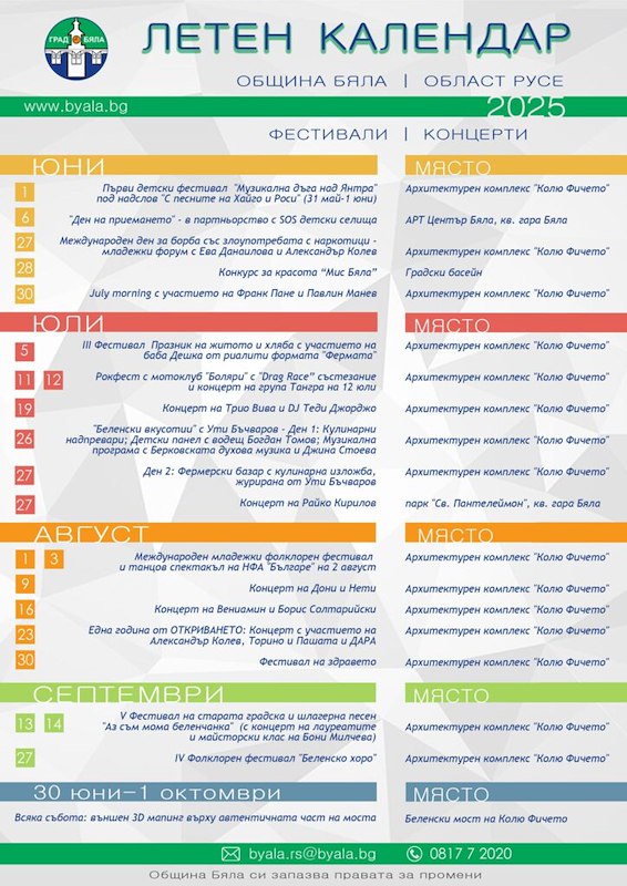Летният календар започва на 31 май с първия детски фестивал "Музикална дъга над Янтра" под надслов "С песните на Хайго и Роси", който ще продължи до 1 юни. Програмата включва разнообразни събития - от конкурс за красота "Мис Бяла" до фестивали на житото и хляба, фолклорни събития и множество концерти на популярни български изпълнители.