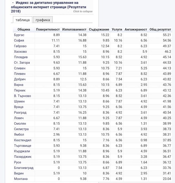 *Коментарът е базиран на информация от www.epi-bg.org, която показва резултатите от Четвъртото годишно изследване на интернет страниците и на страниците в социалните медии на 27-те големи общини (областни центрове). Изследването е част от проекта „Твоята община те очаква онлайн 2018“ и се осъществява по международна методология на глобалния доклад „Дигитално управление на общините в световен мащаб“ (Digital Governance in Municipalities Worldwide) с подкрепата на Посолството на Съединените американски щати в София.