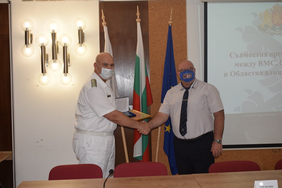 Временно изпълняващият длъжността кмет на Община Русе Енчо Енчев поздрави официално контраадмирал Кирил Михайлов – командир на ВМС, който беше удостоен с награда Плакет „Русе“ за всеотдайна и високопрофесионална дейност, за постигнати високи резултати в изпълнението на служебните задължения по случай 141-ата годишнина от създаването на Военноморските сили на Република България, а след това беше проведена пресконференция.