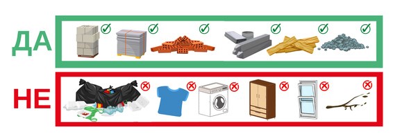 В големите сини контейнери могат да се изхвърлят: бетон, тухли, керемиди, плочки, керамични изделия, дървесина, стъкло, почва, камъни, изолационни материали които не съдържат азбест или опасни вещества, строителни отпадъци на основата на гипс, които не съдържат опасни отпадъци, смесени отпадъци от строителство и събаряне, които не съдържат живак и опасни вещества.
