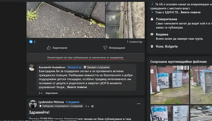 След разкритията за масово триене на жалби и филтриране на общественото недоволство, администрацията на кмета Пенчо Милков рязко смени дигиталната си тактика. Само за часове десетки задържани и невидими досега сигнали за опасни детски площадки, разбити улици и потънали в боклуци квартали внезапно заляха официалната група "Сигнали към Община Русе". За да избегне обаче последващите критики и неудобни въпроси от хората, местната власт наложи нова форма на цензура – модераторите забраниха коментарите под абсолютно всяка нова публикация.