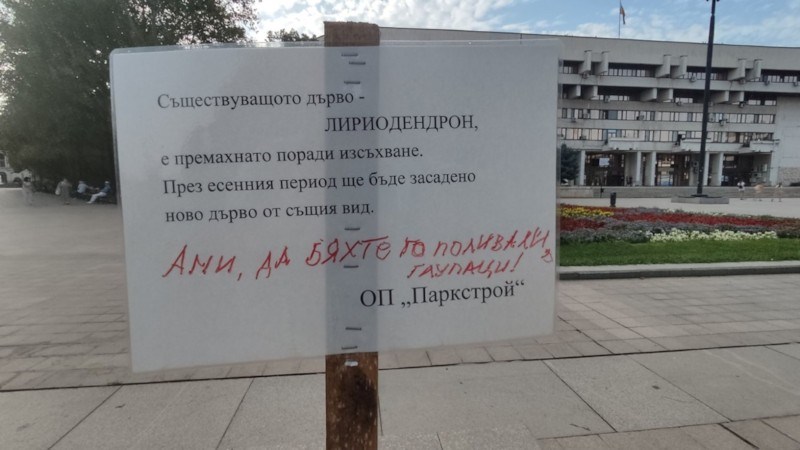 Въпреки че поливането и грижите за едно дърво невинаги са гаранция, че то ще оцелее, както се случва често в природата, вече се намериха и хора, които да се упражнят в негативизъм – върху табелата някой е изписал обидни квалификации към общинското предприятие заради изсъхналото дърво.