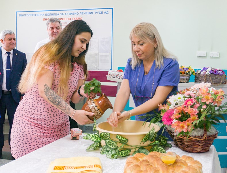 По традиция на празника бе спазен ритуалът за измиване на ръцете. В УМБАЛ „Канев“ майката на 3-дневната Белослава - Цветелина Калчева, изми ръцете на една от най-опитните акушерки - Галина Илиева, която повече от 30 години практикува професията.