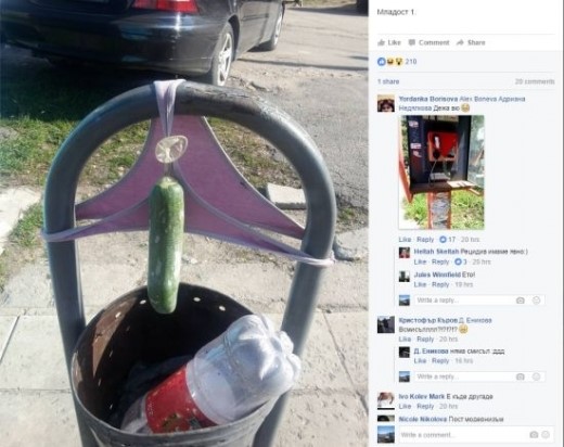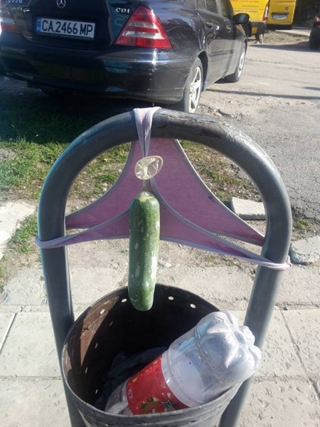 Кошче за боклук осъмна с нетрадиционна униформа. На него са нахлузени розови прашки, а към тях е прикрепена краставица с помощта на презерватив.