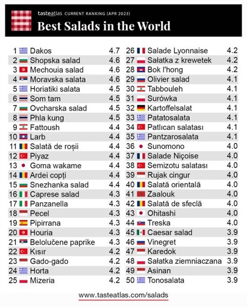 Овчарската салата е на 7-мо място в класацията, а "Снежанка" е на 15-то.