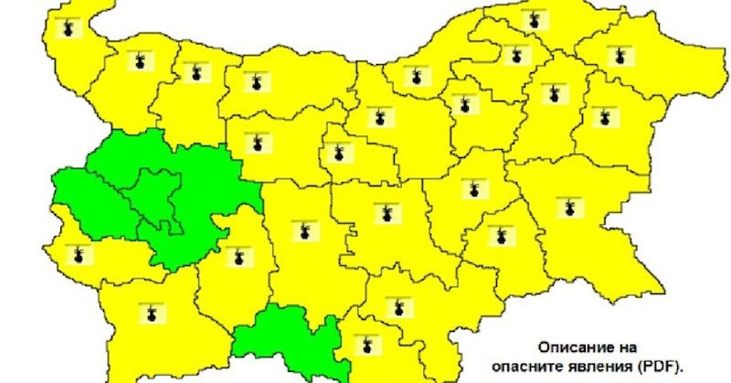 Жълт код за високи температури е обявен за 24 области утре. Максималната температура ще бъде между 36 и 38 градуса. По-поносими ще бъде единствено в София, София-област, Перник и Смолян.