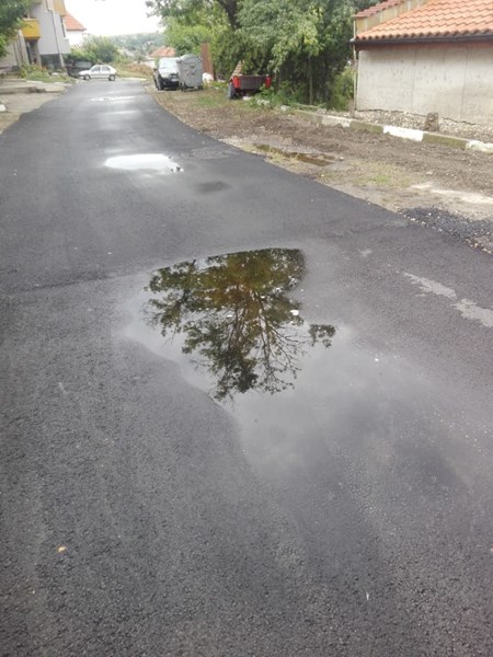 На кадрите се виждат огромни локви по ремонтирана улица, в които човек може да се огледа спокойно, без да търси огледало.