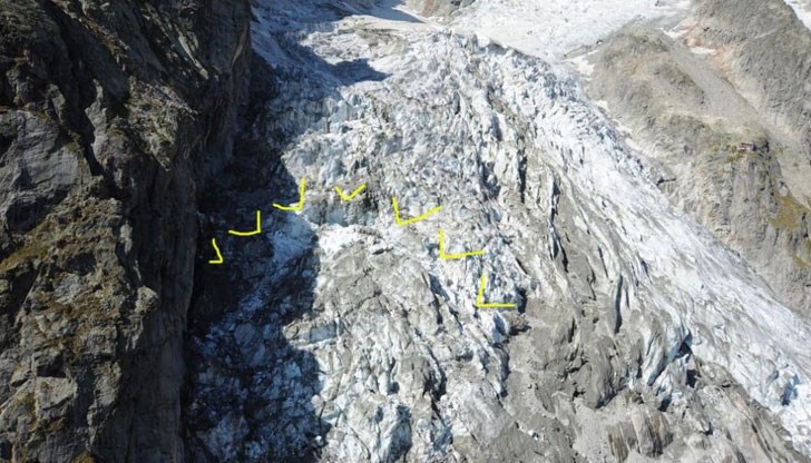 Около 250 000 куб.м лед са в опасност да се откъснат от ледника Planpincieux на връх Grandes Jorasses, заявиха служители. Кметът на близкия град Курмайор заяви, че глобалното затопляне променя планината.
