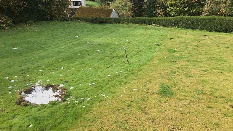 Семейство Хелиуел закусвало спокойно, когато дочули страхотно свистене, което преминало в оглушителен взрив, от който задрънчали стъклата на прозорците. Когато погледнали в градината, видели там полуметров кратер, пълен с бели "камъни".