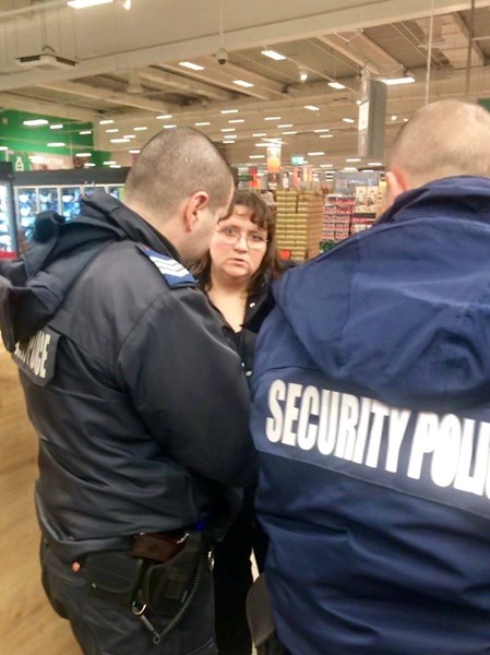 Когато пристига полицията, за да се изясни случая, охранителите и ръководството на магазина се скриват.