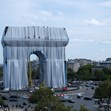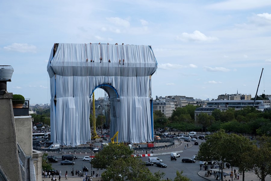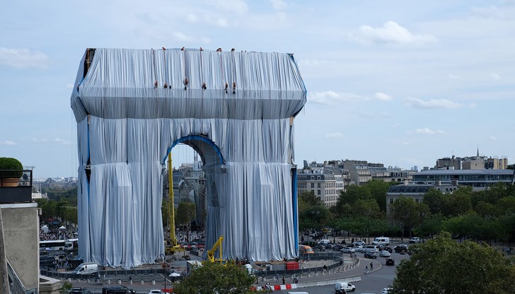 Емблематичната Триумфална арка вече е покрита с драперии от синкаво сребрист плат, така както я е нарисувал Кристо - световния артист от български произход. Това е своеобразна кулминация на работата на екипа, ръководен от Владимир Явашев, който започна работа през април.