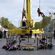 25 000 квадратни метра от плата бяха спуснати на отделни панели от козирката на арката. В реализирането на арт проекта участват професионални катерачи, които помагаха за опаковането на мемориала, висок цели 50 метра, информира БНТ.