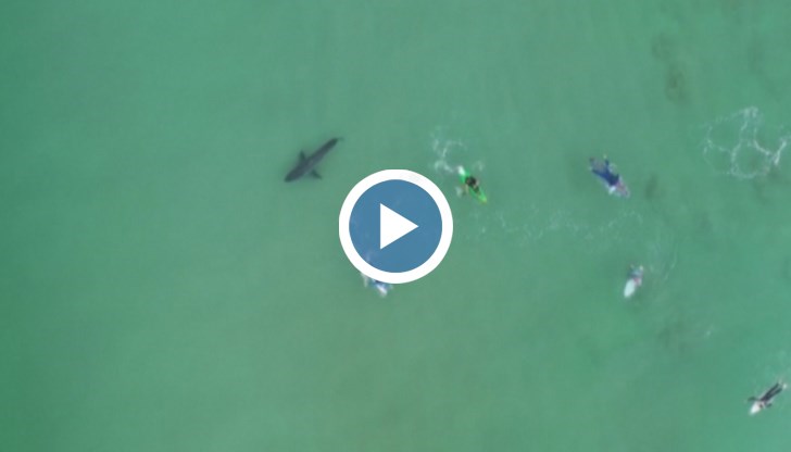 Дрон засне огромна бяла акула в непосредствена близост до сърфисти в Плетенбърг Бей, Република Южна Африка.