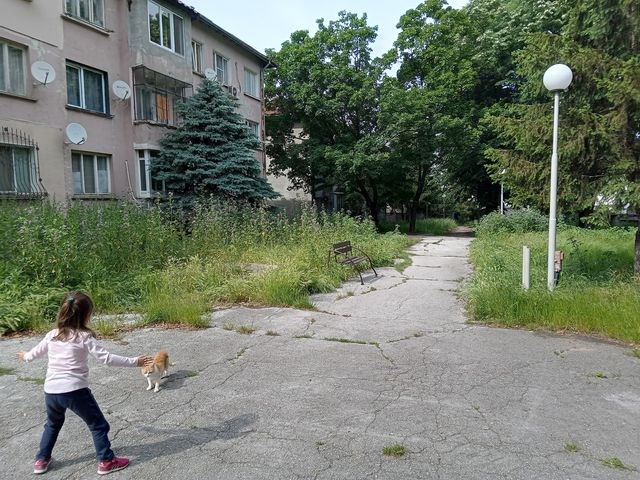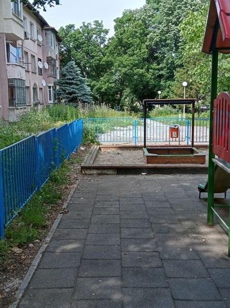 Трева по 2 метра. Изпочупени пейки. Детската площадка - препълнени кошчета, които ги чистят 2 пъти в месеца, а не е достатъчно, защото наблизо има училище и всички участници в междучасията са на детската площадка. Самата площадка я чистят живущите, защото след учениците е нещо ужасно