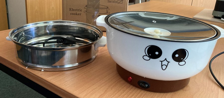 Електрическа готварска печка с марка Womeineng (баркод: 6273684658681) е забранена поради риск от токов удар и изгаряния. Долният ѝ пластмасов капак не е топлоустойчив, което прави достъпни частите под напрежение.