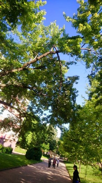 За това сигнализира в редакцията ни притеснен русенец. Читателят ни изпрати снимки, на които се вижда дърво в двора на школото /откъм Кауфланд/, от което е надвиснал голям счупен клон. Под него се движат непрекъснато деца, родители и учители.