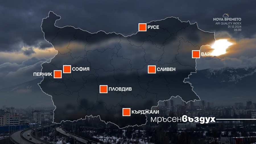 Тревожни нива на замърсяване на въздуха отчитат измервателните станции в седем български града в последния ден на 2024 година. Данните от Изпълнителната агенция по околна среда показват наднормена концентрация на фини прахови частици в София, Перник, Пловдив, Русе, Варна, Сливен и Кърджали.