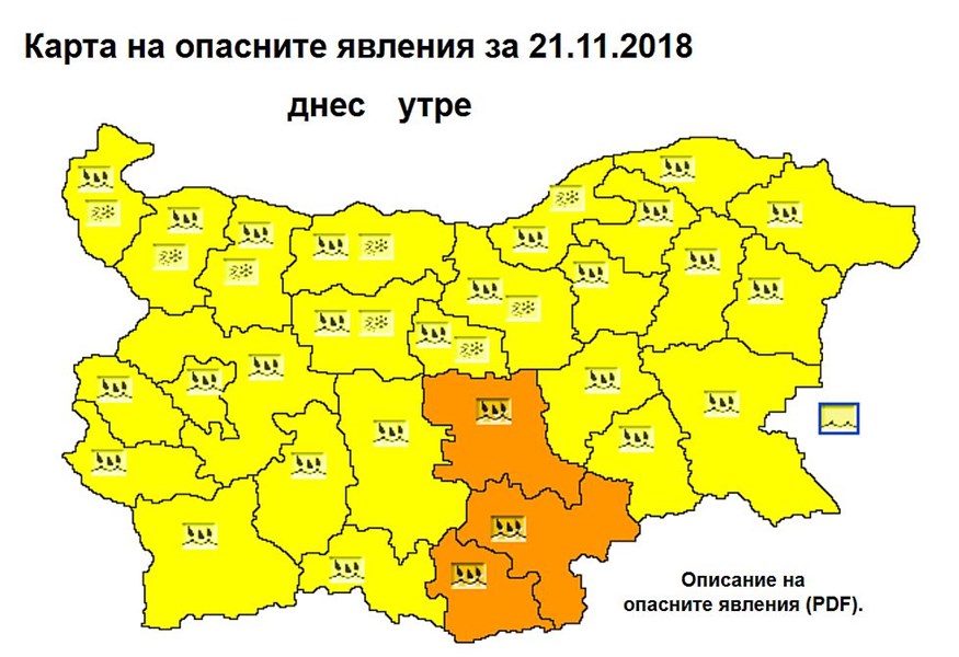 В сряда се очакват интензивни превалявания и синоптиците предупреждават за поледици в цялата страна. Оранжев код за значителни валежи от дъжд е обявен в три области на Южна България - Стара Загора, Хасково и Кърджали. Там се очаква да паднат между 30 и 50 л/кв.м. В останалата част от страната е обявен жълт код за дъжд и очакванията са за 20 и 30 л/кв.м, като в 8 области има предупреждение и за образуване на поледици - Видин, Монтана, Враца, Плевен, Ловеч, Габрово, Велико Търново и Русе.