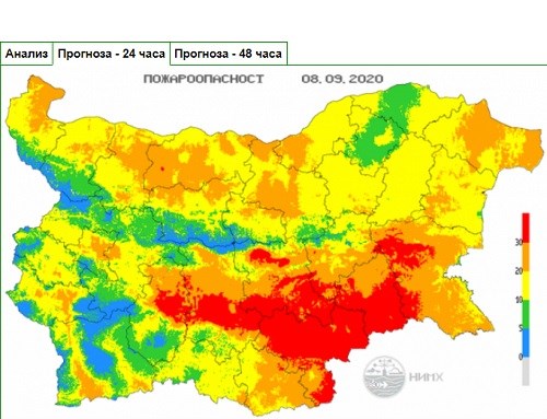Екстремален индекс за пожароопасност е в сила за територии от 8 области в страната за 8 септември.