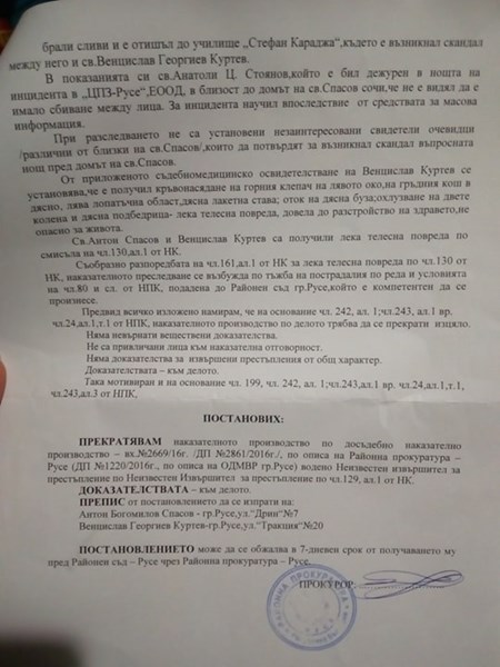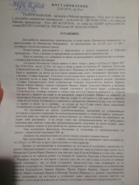 Всички са оправдани, доказателствата и самопризнанията са заличени. Най-нагло цялата случка е променена и едва ли не Антон Спасов сам е отишъл при тях да се бие. Прилагам и документи, за да видят всички как за пореден път те са жертвите.