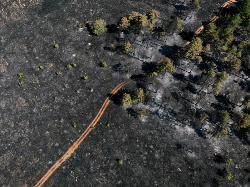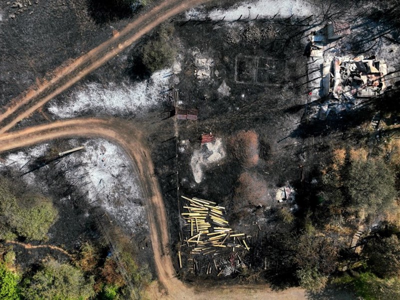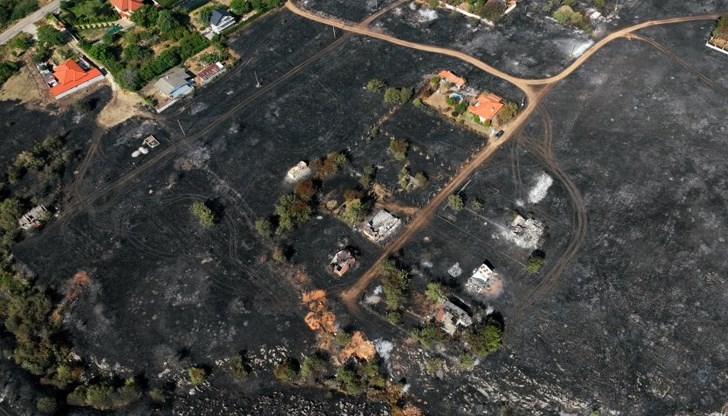 Въздушните кадри разкриват как огънят е преминал през вилните зони, оставяйки след себе си само въглища и пепел на мястото на някогашни домове. Боровата гора в района на Безден е почти напълно унищожена, а димът все още се издига от отделни огнища.