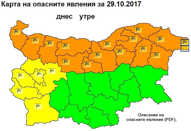 Оранжевият код е в сила за областите Видин, Монтана, Враца, Плевен, Ловеч, Габрово, Велико Търново, Русе, Търговище, Разград, Силистра, Шумен, Варна и Добрич.