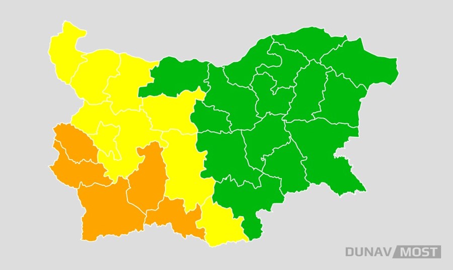 Днес времето в страната ще бъде предимно облачно, като на много места в Западна и Централна България се очакват валежи от дъжд. Най-интензивни ще бъдат валежите в Западна България и Родопите, като на места ще има гръмотевични бури. За пет области в Югозападна България е обявен оранжев код за опасно време – Перник, Кюстендил, Благоевград, Пазарджик и Смолян. В тези региони дъждовете ще бъдат силни, придружени с гръмотевици, а количествата валежи могат да достигнат до 60 милиметра. В същото време, в осем области в Северозападна и части от Западна България е въведен жълт код за умерени валежи. Областите Видин, Монтана, Враца, София град, Софийска област, Ловеч, Пловдив и Кърджали ще получат между 20 и 35 милиметра дъжд.