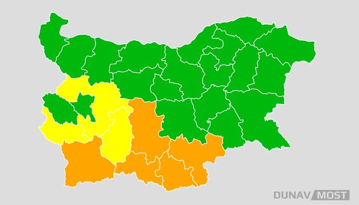 Оранжев код за опасни метеорологични условия е обявен за неделя в пет области на страната. Най-големи количества валежи се очакват в областите Благоевград, Смолян, Пловдив, Кърджали и Хасково, където прогнозата сочи между 40 и 50 литра на квадратен метър. В планинските райони се очаква снеговалеж със снежна покривка от 10 до 20 сантиметра.